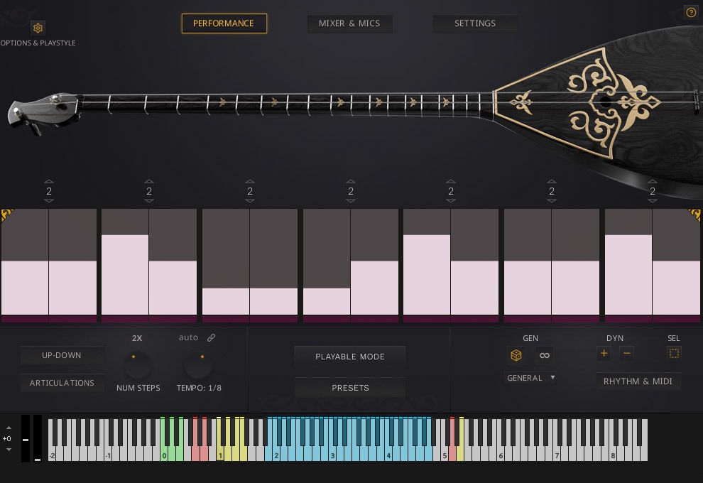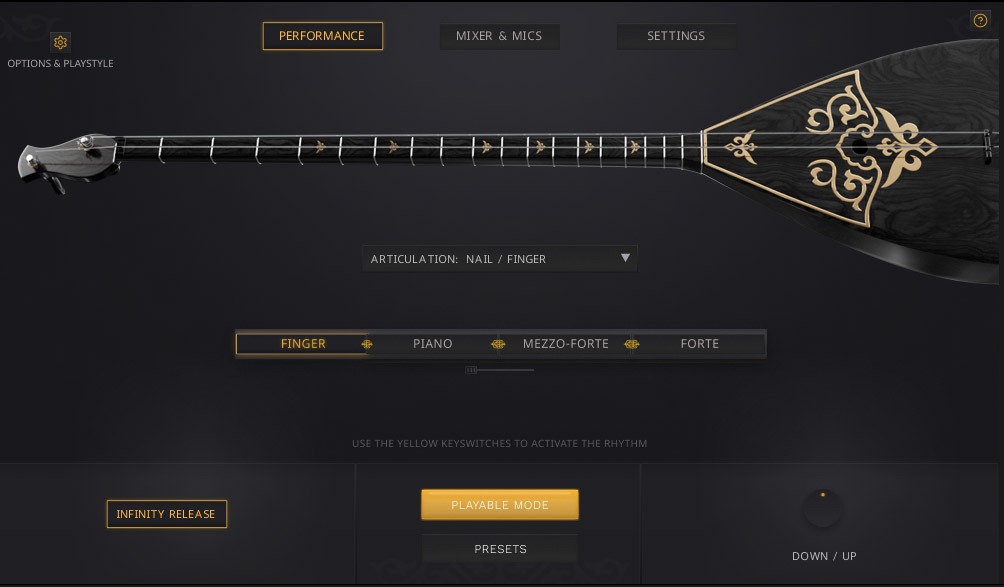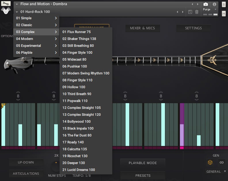 The main idea behind Flow & Motion – Dombra is to create a powerful rhythm instrument that is easy to use. You don’t need to know how the engine works. Just press a few keys, and the instrument will automatically choose the right string and fret. The instrument performs with the same natural feel, timing, and dynamics as a real player.