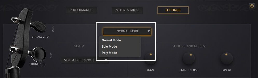 Dombra offers several play modes. In Normal mode, it plays like a real two-string instrument with natural string behavior. Solo mode is designed for playing melodic or lead parts with full expression. Polyphonic mode is useful for playing full chords and harmonies. It surpasses the original instrument’s physical limitations and allows for maximum freedom.