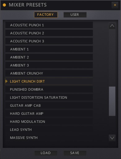 Presets window with Factory and User presets for Performance and Mixer & Mics.