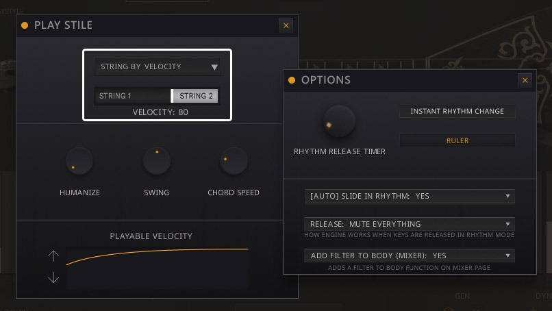 Dombra is fully sampled. By default, the engine intelligently selects the appropriate string to produce the best sound. However, if more control is needed, the string can be manually chosen using velocity. This shapes the sound and provides additional control, as it is well known that the same note played on different strings can have a slightly different tone and character.